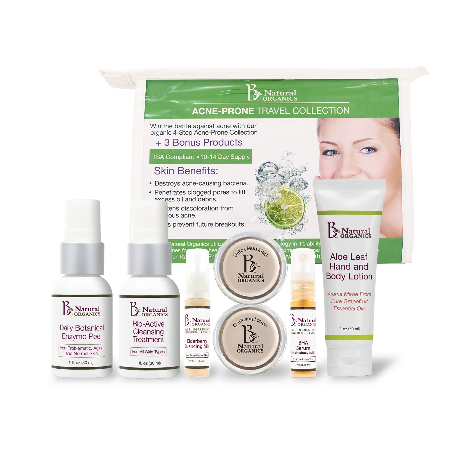 This Blemish fighting collection contains all the products you need to help you maintain the healthier skin you have acquired while using BNO’s blemish prone products. Travel without worries with this skin care regimen as it is TSA-compliant. Buy your Acne Prone Travel Collection today and don’t leave home without it!